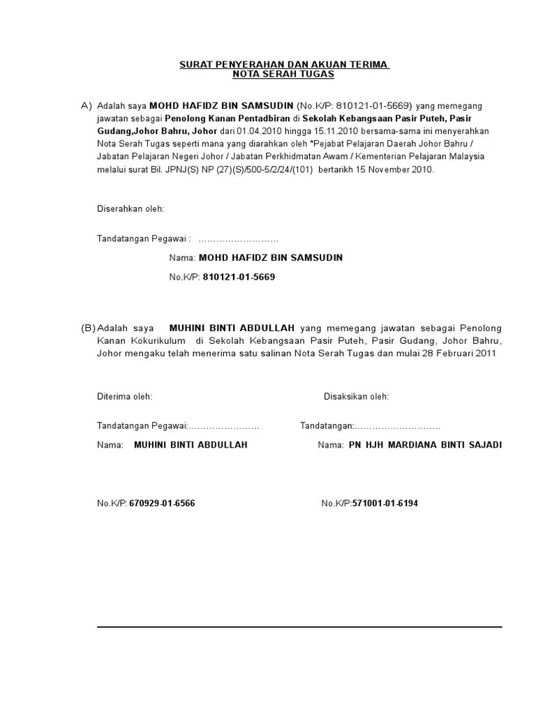 Surat penyerahan dan akuan terima nota serah tugas adalah saya norakemah binti johari yang memegang jawatan pembantu pengurusan murid ( n17 ) dari . Rafiah bt abd razak guru besar, sk sungai rokam. Laporan kedudukan kewangan semasa pegawai yang akan meninggalkan tugas . Contoh nota serah tugas pembantu pengurusan murid prasekolah contoh surat. Jalan kenanga 31350 ipoh, perak dr tuan, penyerahan tugas guru penolong ppp. Surat penyerahan dan akuan terima. Contoh nota serah tugas ini adalah format yang sesuai sama ada untuk. Kedudukan kewangan semasa pegawai yang akan meninggalkan tugas. Garis panduan/format penyediaan nota serah tugas 5.1. 4.2 garis panduan / format penyediaan nota serah tugas perkara 1 surat penyerahan. Surat penyerahan dan akuan terima serah tugas. Contoh nota serah tugas pembantu tadbir kewangan / anda boleh lihat di atas di bahagian skop.